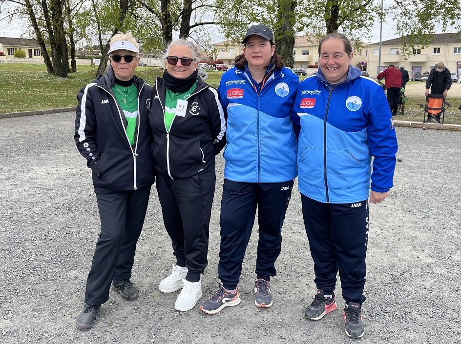 Les parties qualificatives d'un bon niveau qualifient deux équipes pour le championnat de France des 26 et 27 juillet à Saint Yrieix (16) : les championnes de Gironde, Marine Terrien et Mélanie Zawadzki de La Boule du Lac et les vice-championnes Deborah Thebaud et Elodie Mérignac de la Pétanque Bazadaise. Trois équipes se qualifient pour le championnat régional du 7 juin à Neuvic (24) : Jacqueline Arnal - Sylvie Trabac / Pétanque du Pin -- Caroline Ghio - Stéphanie Chassin / C M O Bassens -- Chloé Lalande - Céline Gonzalez / Boule du Lac.